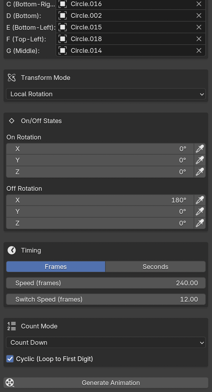 Blender 5.0 automator for 7 segment counters. Features: keyframing animations, count up/down, count from to, make cyclic, frame and second times, movement types (local rotation, global rotation, local movement, global movement, scale).